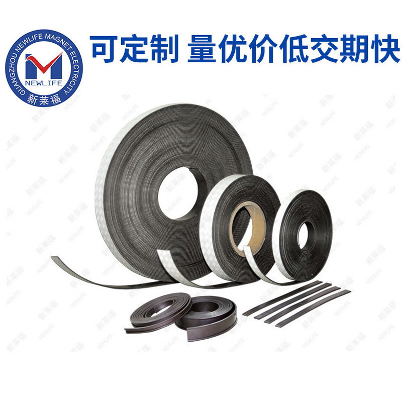 橡膠磁條的特征 橡膠磁條具有柔韌性、彈性、可繞曲性,經過擠出、壓延、注射、模具成型等工藝可生產成卷狀、片狀、條狀、塊狀、圓環及各種復雜形狀。它表面還可以覆PVC片、銅版紙、雙面膠,涂UV油,或者彩印模切成各種形狀。